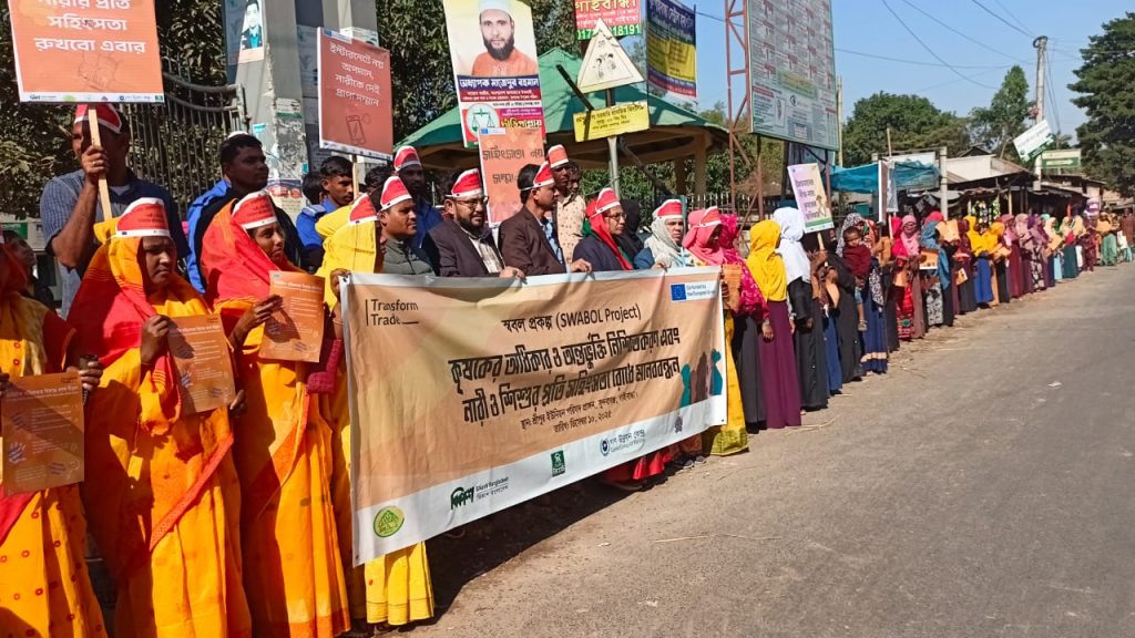 ইউরোপিয়ান ইউনিয়ন ও ট্রেডক্রাফট এক্সচেঞ্জ সহযোগিতায় গণ উন্নয়ন কেন্দ্র(GUK) বাস্তবায়নে জেলা ও উপজেলা কৃষি পণ্য উৎপাদক অ্যাসোসিয়েশনের আয়োজনে ২৫ নভেম্বর হতে ১০ ডিসেম্বর আন্তর্জাতিক নারী নির্যাতন প্রতিরোধ পক্ষ ২০২৫ উদযাপন উপলক্ষ্যে “নারী ও কিশোরীর প্রতি ডিজিটাল সহিংসতা প্রতিরোধ করি” এই প্রতিপাদ্যকে সামনে রেখে ১৬ দিনব্যাপী ক্যাম্পেইনের অংশ হিসেবে ১০ ডিসেম্বর সুন্দরগঞ্জ উপজেলার শ্রীপুর ইউনিয়ন পরিষদ মাঠে ‘’SWABOL’’ প্রকল্পের জেলা ও উপজেলা কৃষি পণ্য উৎপাদক অ্যাসোসিয়েশন সদস্যদের অংশগ্রহণে মানববন্ধন ও পালাগানের আয়োজন করা হয়। উক্ত অনুষ্ঠানে উপস্থিত ছিলেন সুন্দরগঞ্জ উপজেলা যুব উন্নয়ন কর্মকর্তা জাফর আহম্মেদ (লস্কর), শ্রীপুর ইউনিয়ন পরিষদ চেয়ারম্যান মোঃ আজহারুল ইসলাম, অবসরপ্রাপ্ত উপাধাক্ষ সুন্দরগঞ্জ মহিলা ডিগ্রী কলেজ ও লেখক সংগঠক নাসরিন সুলতানা, উপজেলা কৃষি পণ্য উৎপাদক অ্যাসোসিয়েশনের সভাপতি জয়গুন বেগম,সহ-সভাপতি সামছুসাহার