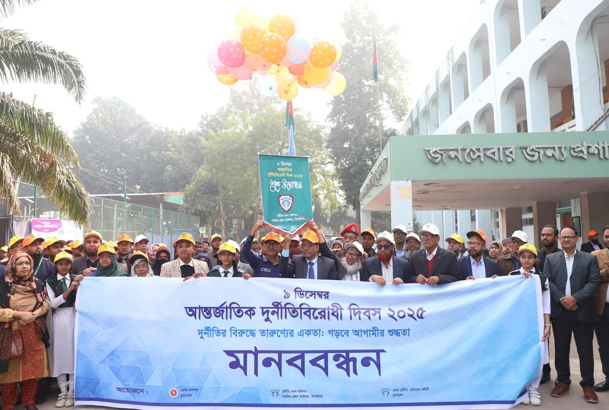 চুয়াডাঙ্গা জেলা প্রশাসক কার্যালয় চত্বরে জেলা প্রশাসন ও দুর্নীতি দমন কমিশন সমন্বিত জেলা কর্তৃক আয়োজিত ৯ ডিসেম্বর ২০২৫ খ্রিঃ সকাল ১০ টায় “দুর্নীতির বিরুদ্ধে তারুণ্যের একতা, গড়বে আগামীর শুদ্ধতা” প্রতিপাদ্য বিষয়কে সামনে রেখে আন্তর্জাতিক দুর্নীতি বিরোধী দিবস-২০২৫ উপলক্ষে মানববন্ধন ও আলোচনা সভা অনুষ্ঠিত হয়। উক্ত আয়োজনে সম্মানিত অতিথি হিসাবে উপস্থিত ছিলেন মোহাম্মদ মনিরুল ইসলাম, পুলিশ সুপার, চুয়াডাঙ্গা।