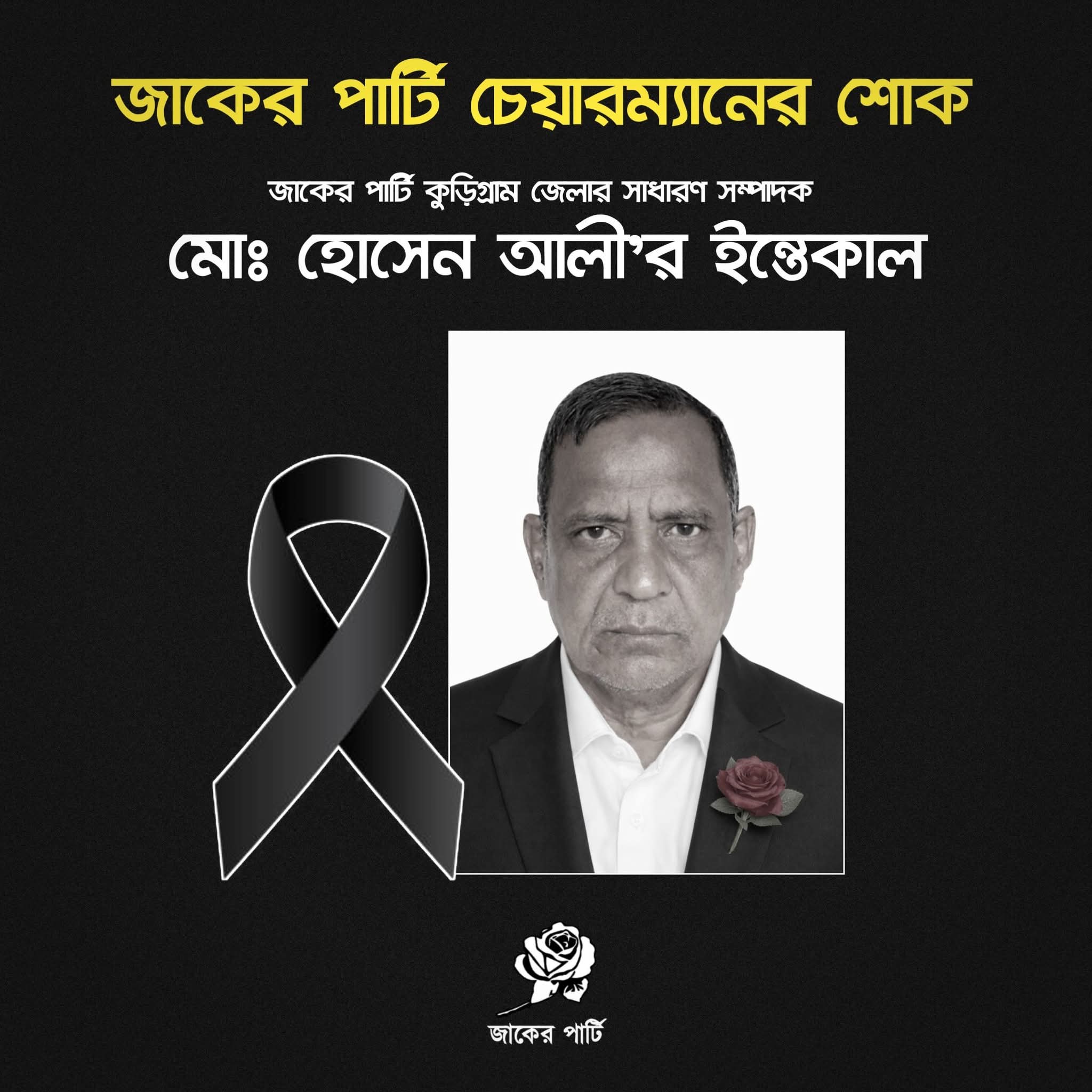 জাকের পার্টি চেয়ারম্যান মোস্তফা আমীর ফয়সল কুড়িগ্রাম জেলা জাকের পার্টির সাধারণ সম্পাদক মোঃ হোসেন আলীর ইন্তেকালে গভীর শোক ও দুঃখ প্রকাশ করেছেন।
