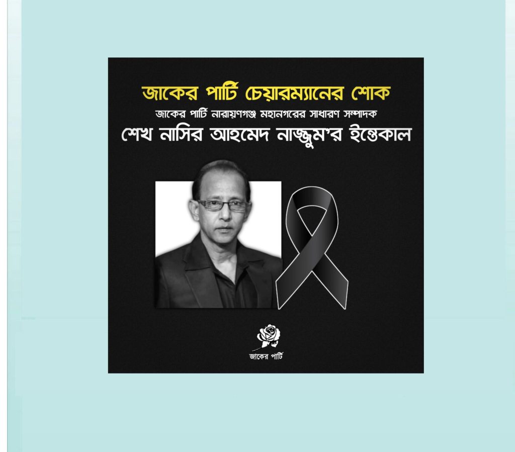 জাকের পার্টি চেয়ারম্যান মোস্তফা আমীর ফয়সল নারায়ণগঞ্জ মহানগর জাকের পার্টির সাধারণ সম্পাদক শেখ নাসির আহমেদ নাজ্জুম’র ইন্তেকালে গভীর শোক ও দুঃখ প্রকাশ করেছেন।
